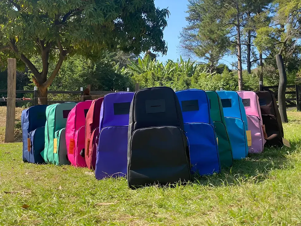 Mochila hípica resistente, ideal para transportar botas e capacete com segurança. Possui compartimentos organizados para proteger seu equipamento.